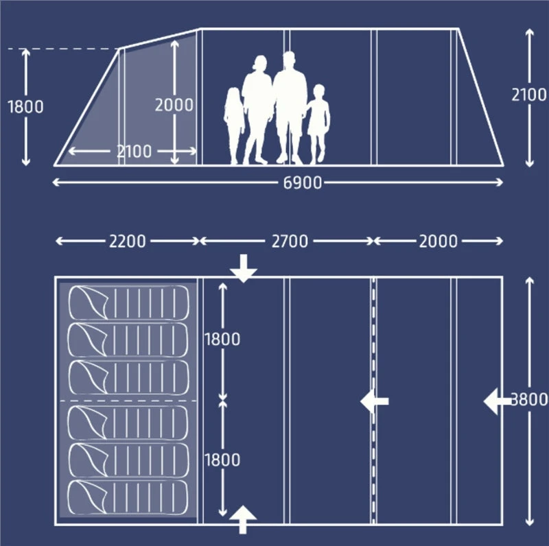 Kampa Hayling 6 Poled Tent 2021 Model – 3 section tunnel tent, spacious for the whole family.