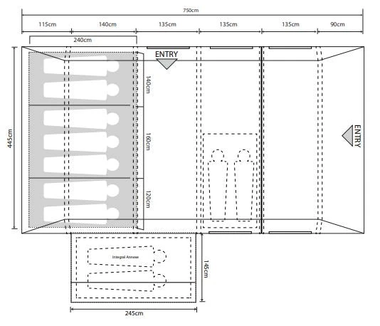 - Footprint 705 x 445cm (Main body) + 245 x 145cm (Side Annexe)