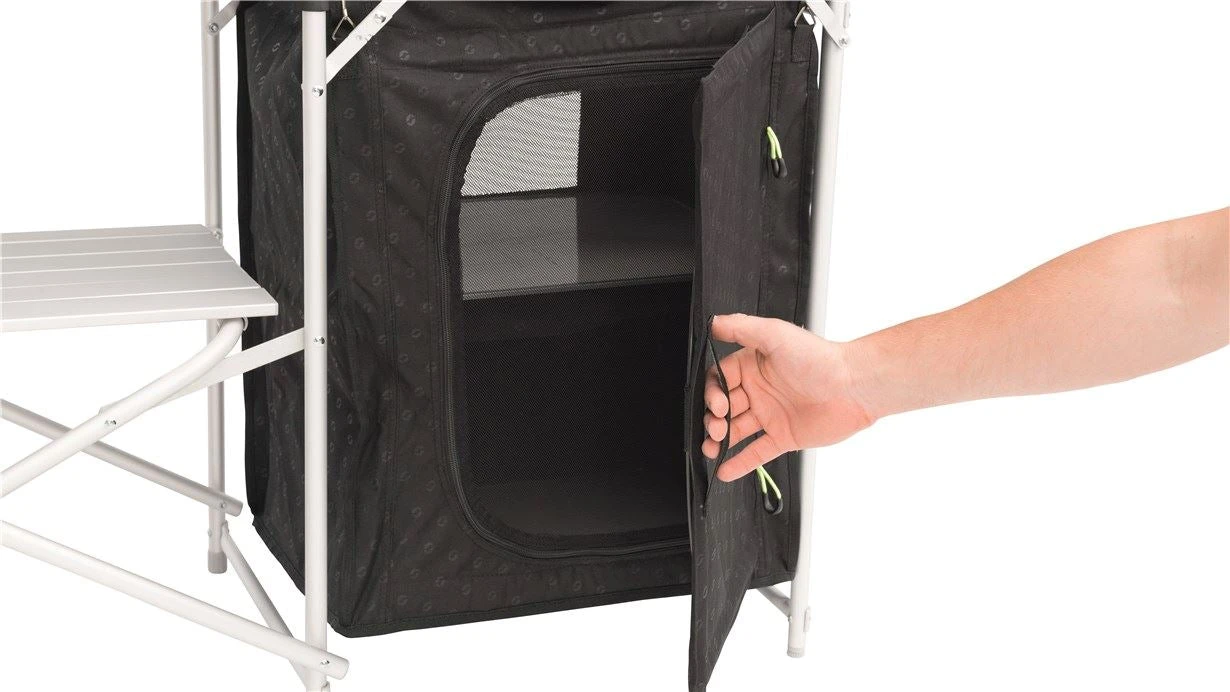 Create a safe kitchen area at your campsite with thanks to Outwell’s Camrose Kitchen Unit with table tops providing work space for preparing and serving food. The unit also includes a windshield allowing you to cook food with ease in windy conditions. The table storage space is made from durable embossed polyester fabric with zip closure that can be folded away neatly for access.